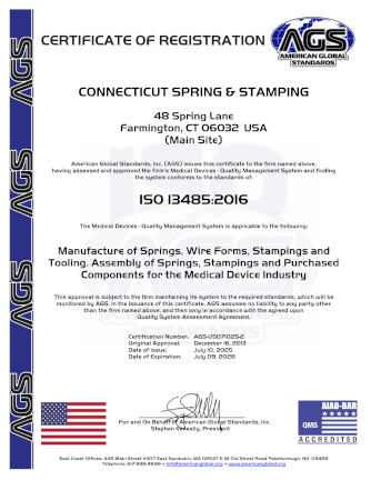 The American Systems Registrar has audited and approved Connecticut Spring & Stamping for quality management systems applicable to the design, support and manufacture of springs, wire forms, metal stampings, and tooling and for the assembly of springs, stampings and purchased components.